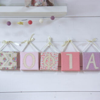 Η πιο ιδιαίτερη ιδέα για το όνομα του μωρού στο βρεφικό δωμάτιο! Καμβαδάκι 10×10εκ, με το κάθε γράμμα ξεχωριστά κεντημένο απλικέ σε αποχρώσεις του ροζ.Σε περίπτωση που θέλετε διαφορετικά χρώματα/υφάσματα επικοινωνήστε μαζί μας για να φτιάξετε τον δικό σας μοναδικό συνδιασμό! Οι υφες, τα υφάσματα και τα χρώματα που μπορείτε να χρησιμοποιήσετε, άπειρα! Κάθε καμβαδάκι κρεμιέται με σατέν κορδελάκι και τα υφάσματα που χρησιμοποιούμε είναι βαμβακερά.