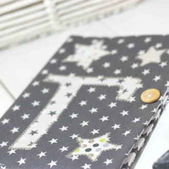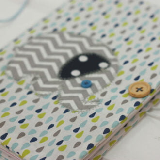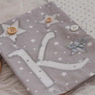 Ιδιαίτερη , χειροποίητη θήκη βιβλιαρίου υγείας σε λευκό, γκρι και μωβ αποχρώσεις από βαμβακερά υφάσματα.