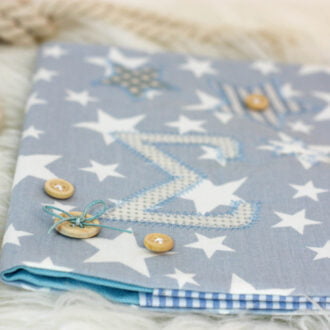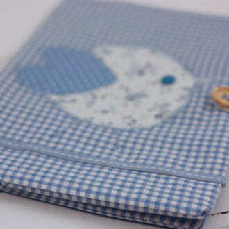 Ιδιαίτερη , χειροποίητη θήκη βιβλιαρίου υγείας σε γκρι και ροζ αποχρώσεις από βαμβακερά υφάσματα σε σχέιο φεγγαράκι.