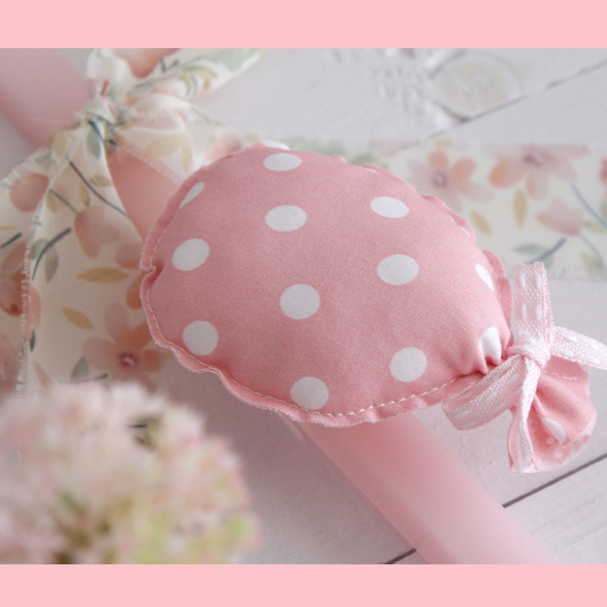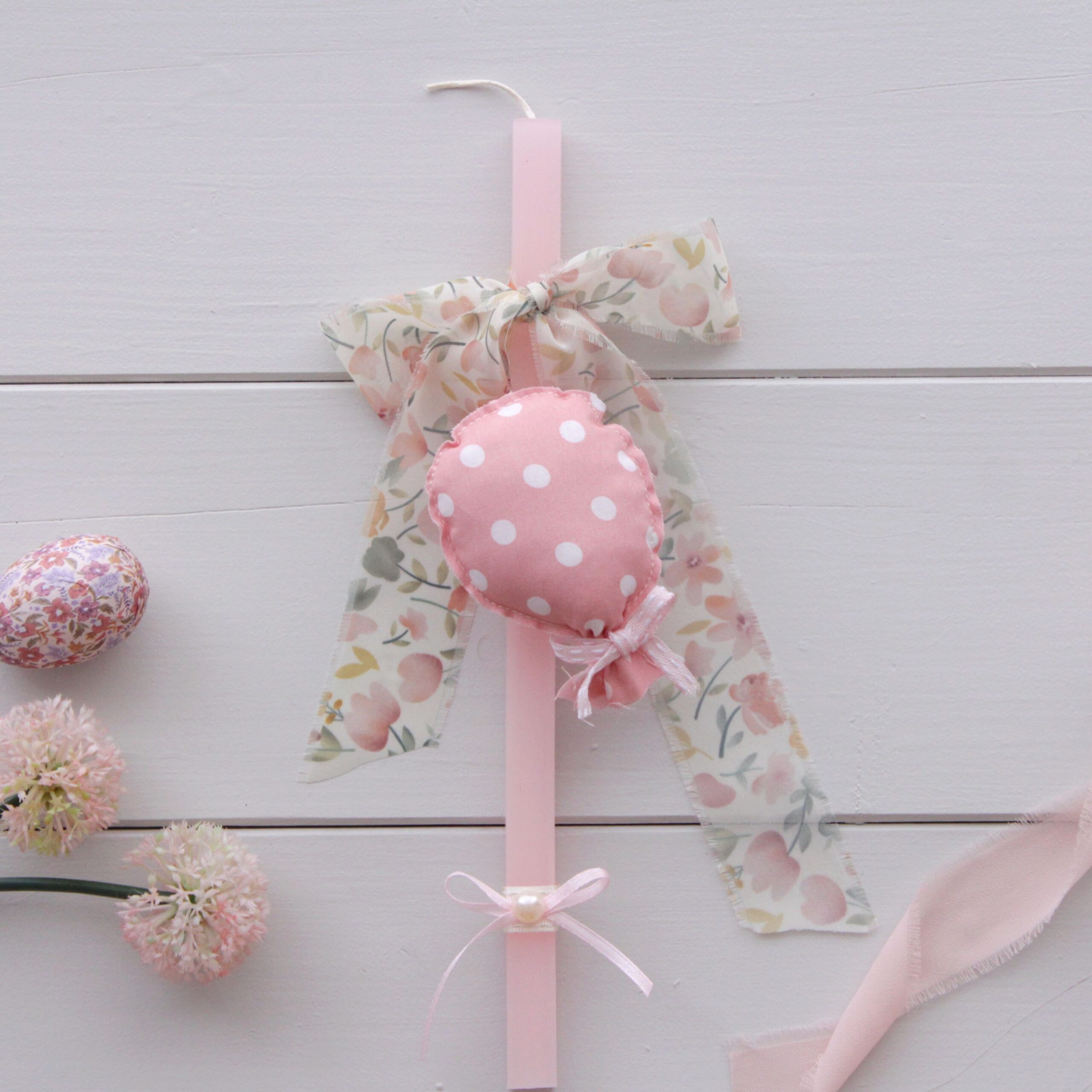 Χειροποίητη πασχαλινή λαμπάδα σε απαλές παστέλ αποχρώσεις του ροζ, διακοσμημένη με υφασμάτινο μπαλόνι και ρομαντικά φιογκάκια.