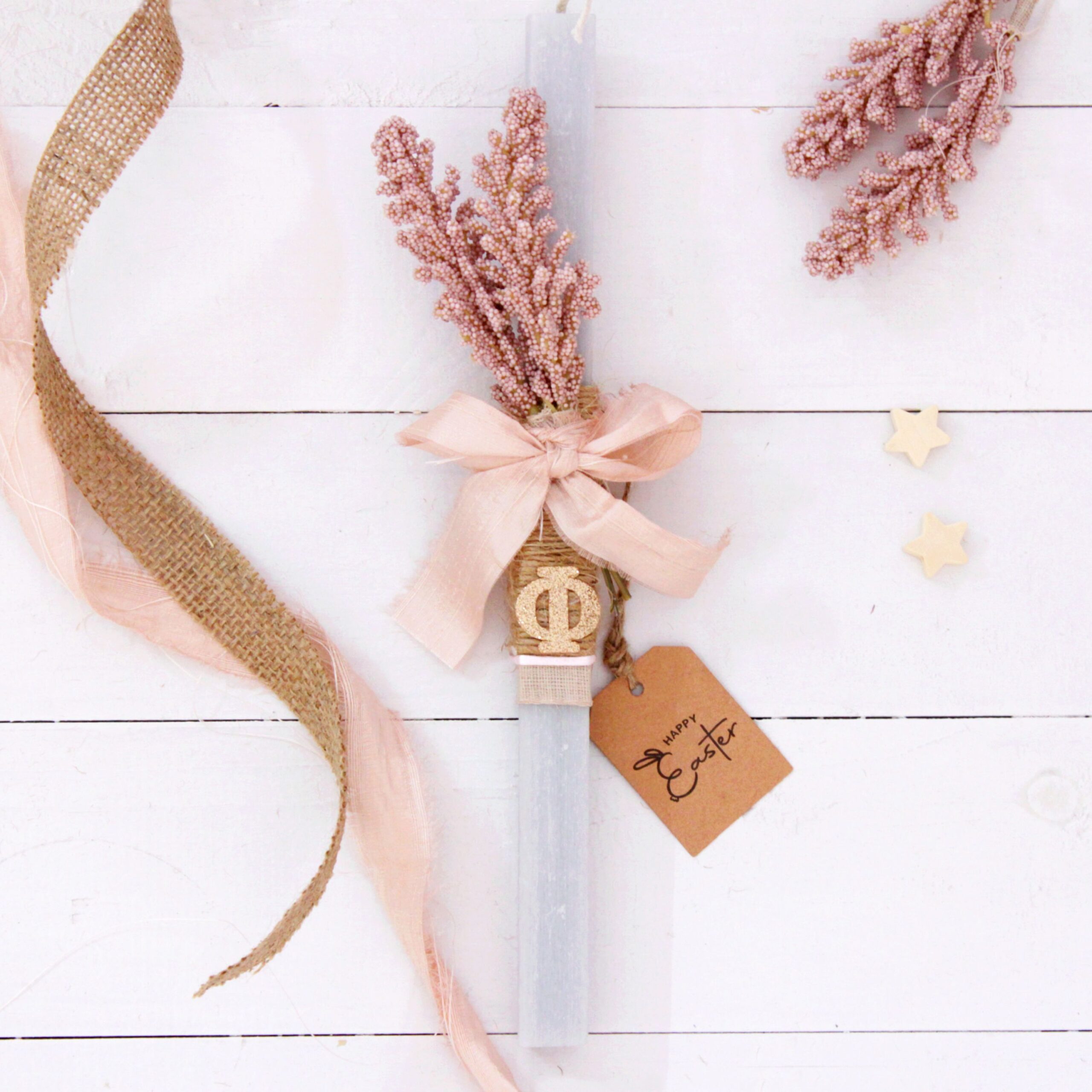 Χειροποίητη πασχαλινή λαμπάδα σε απαλές αποχρώσεις του ροζ, διακοσμημένη με dusty pink ανθάκια, φιόγκο από ταφτά μεταξωτό ύφασμα και χρυσό glitter μονόγραμμα.