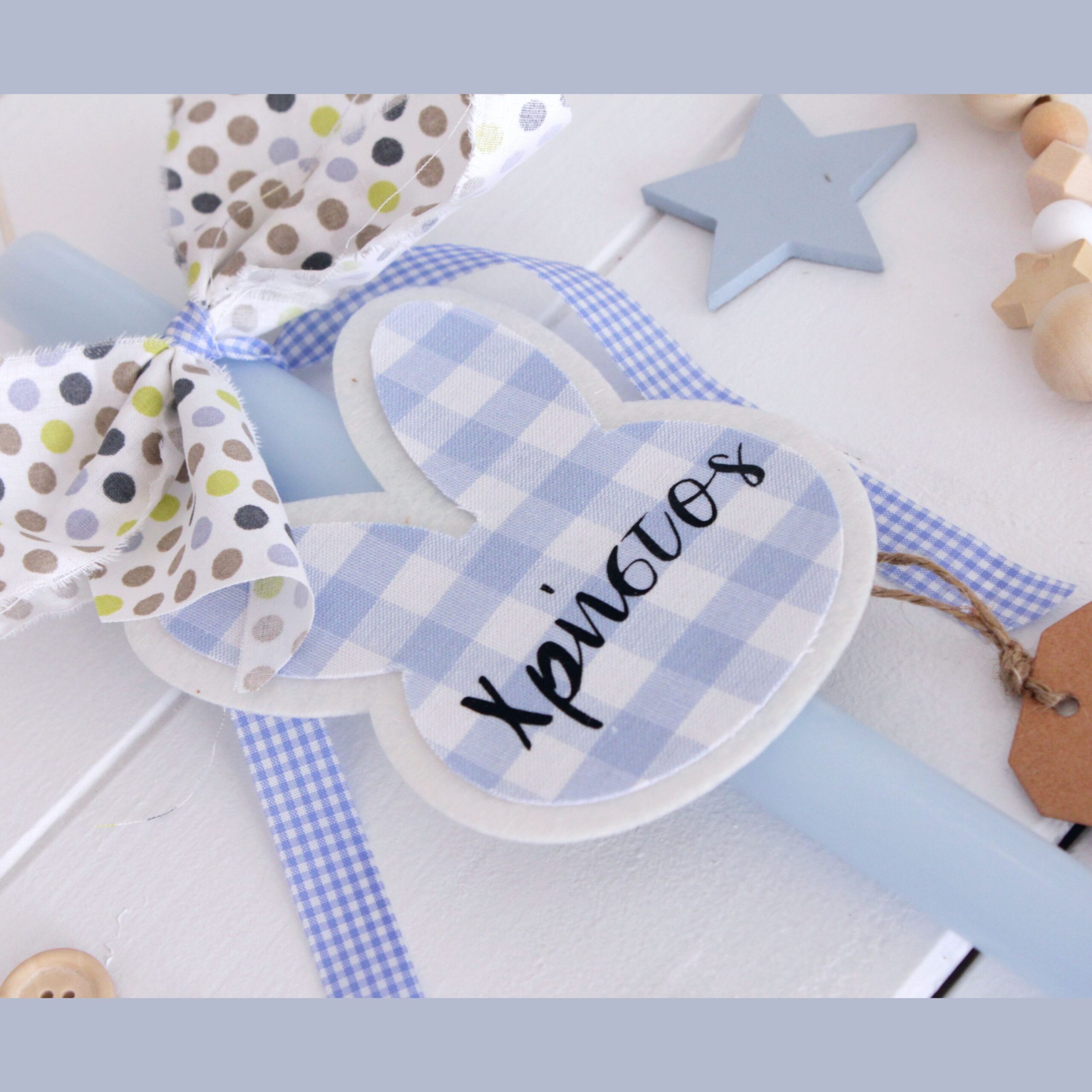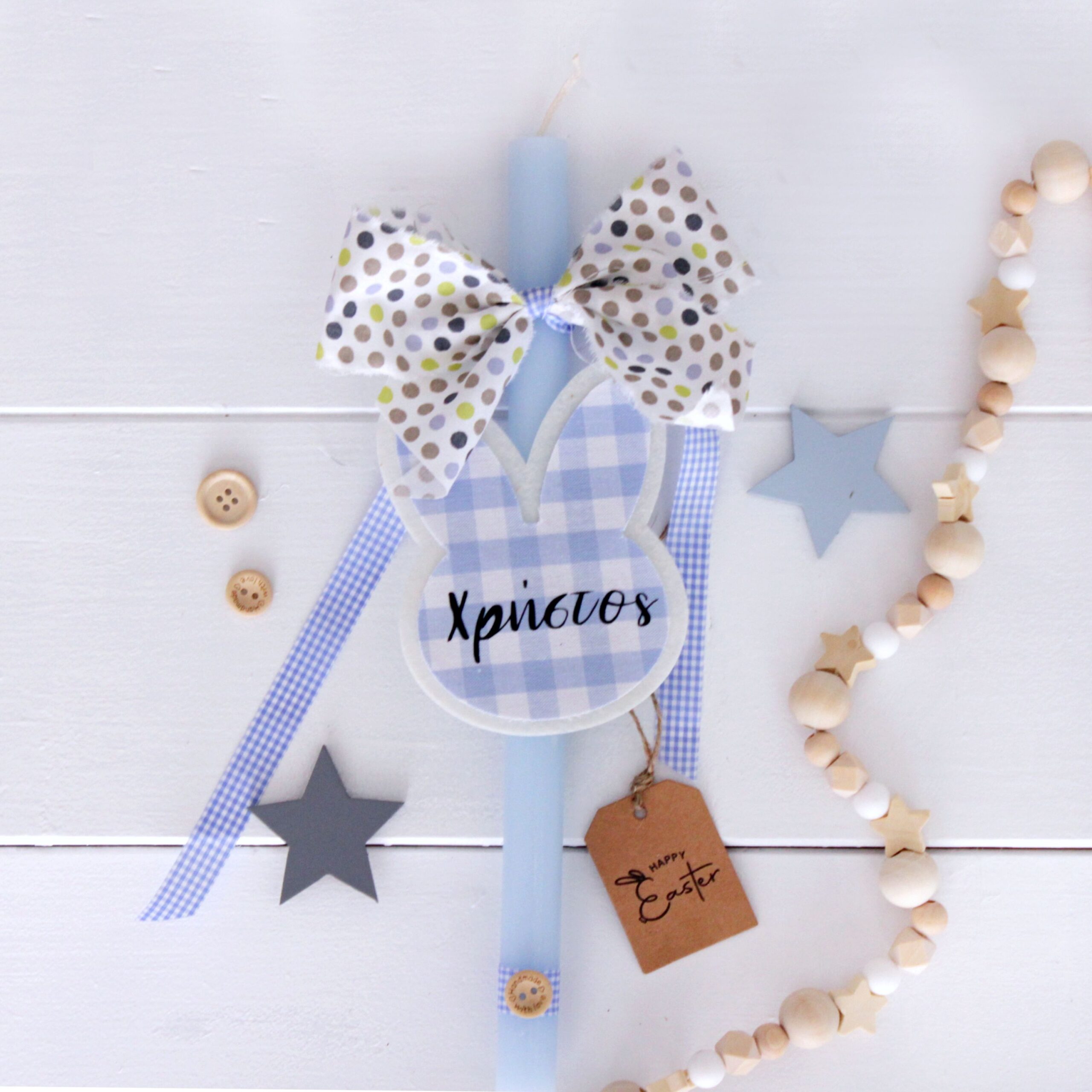 Χειροποίητη πασχαλινή λαμπάδα σε απαλές παστέλ αποχρώσεις του θαλασσί, διακοσμημένη με υφασμάτινο λαγουδάκι από ύφασμα θαλασσί καρό, όμορφο πουά μεγάλο φιόγκο και τυπωμένο όνομα της επιλογής σας.
