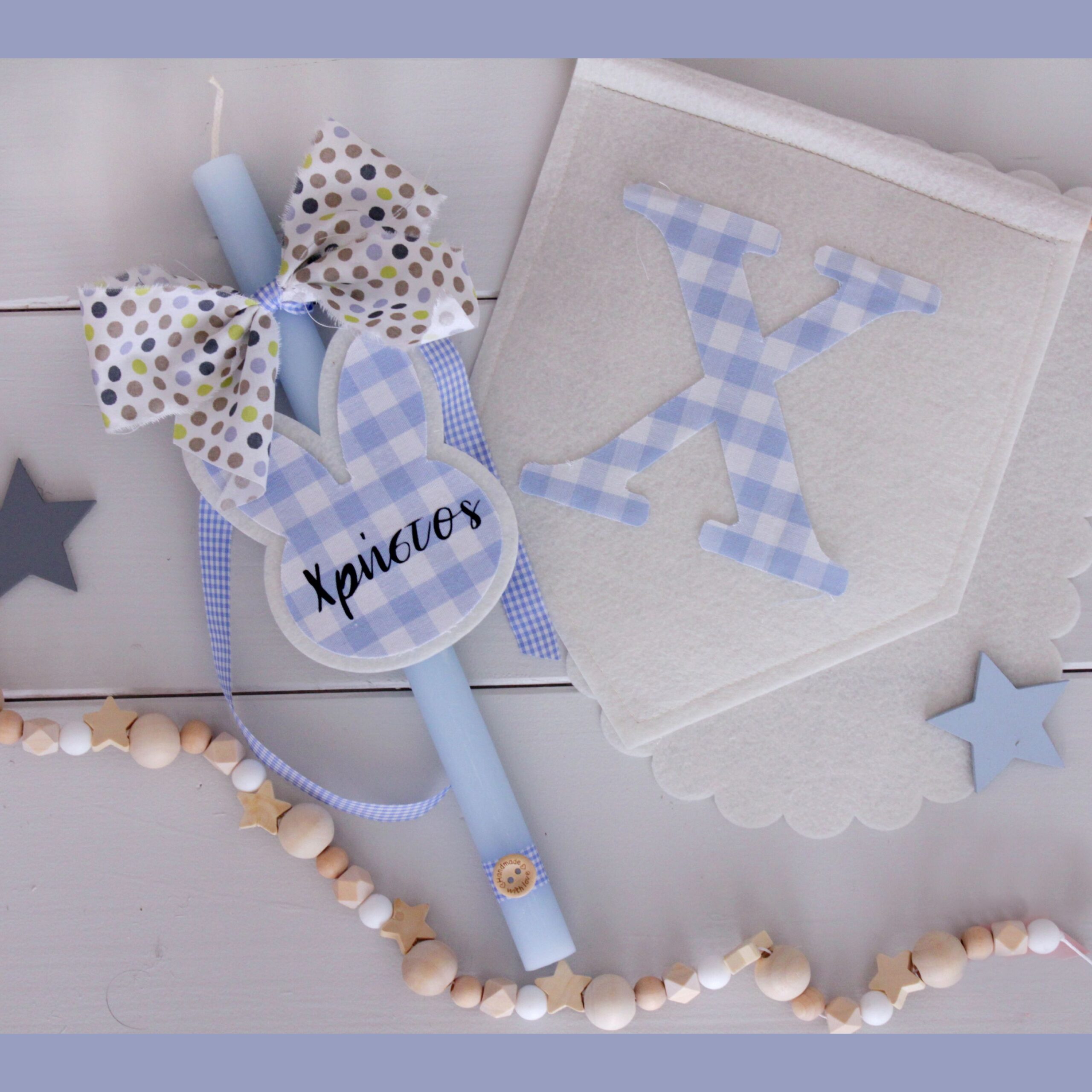 ✨ Υπάρχει επίσης η δυνατότητα να συνδυαστεί με διακοσμητικό banner με το μονόγραμμα του παιδιού, φτιαγμένο από το ίδιο ύφασμα με τη λαμπάδα, για ένα όμορφο και ταιριαστό σετ.