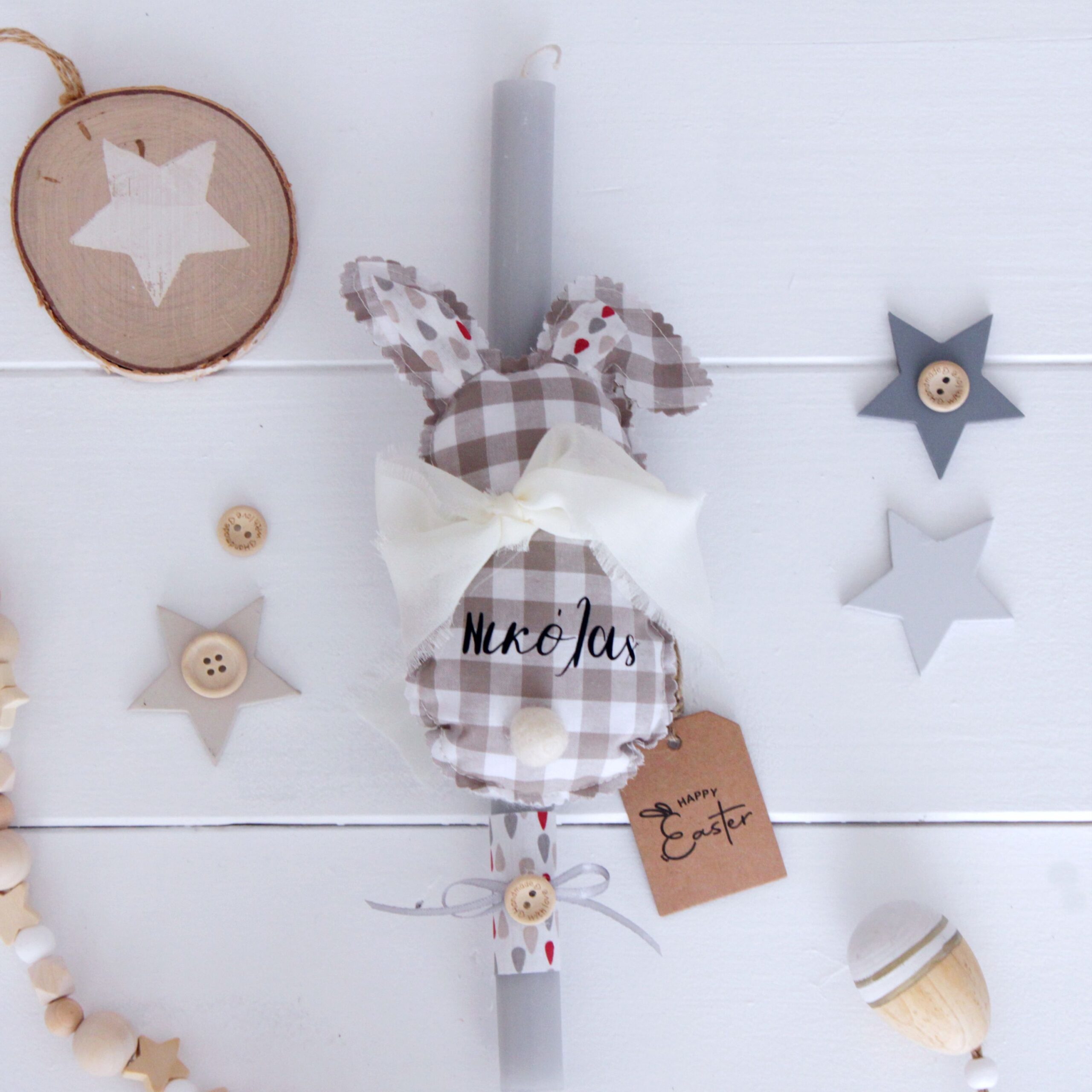 Οι πασχαλινές μας λαμπάδες είναι εξ ολοκλήρου χειροποίητες και δημιουργούνται με ιδιαίτερη φροντίδα στη λεπτομέρεια. Διακοσμούνται με υφασμάτινα στοιχεία από οργανικά υφάσματα και απαλά παστέλ χρώματα, που χαρίζουν σε κάθε λαμπάδα μοναδικό χαρακτήρα.